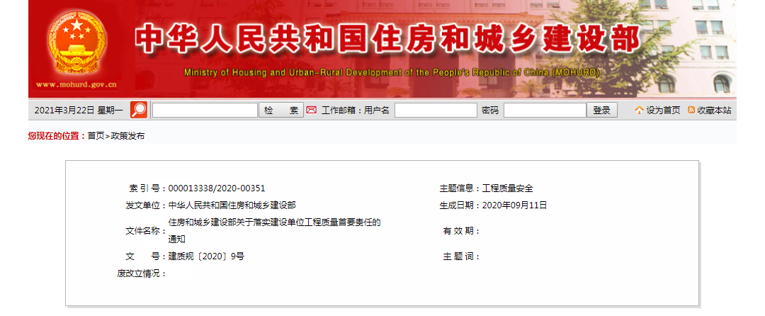 2020年9月23日,住建部官網發布《關于落實建設單位工程質量首要責任的通知》,嚴格落實建設單位工程質量首要責任。同時提出: