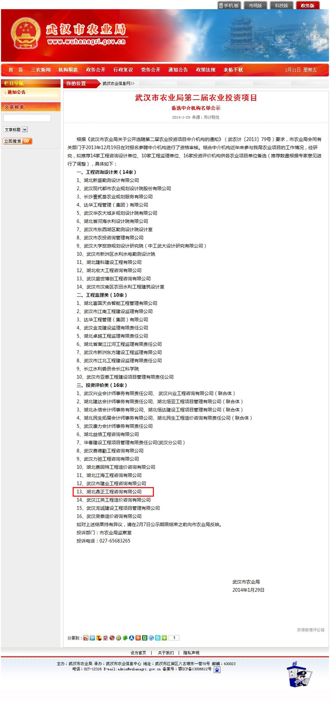 我公司入選武漢市農業局第二屆農業投資項目中介機構庫