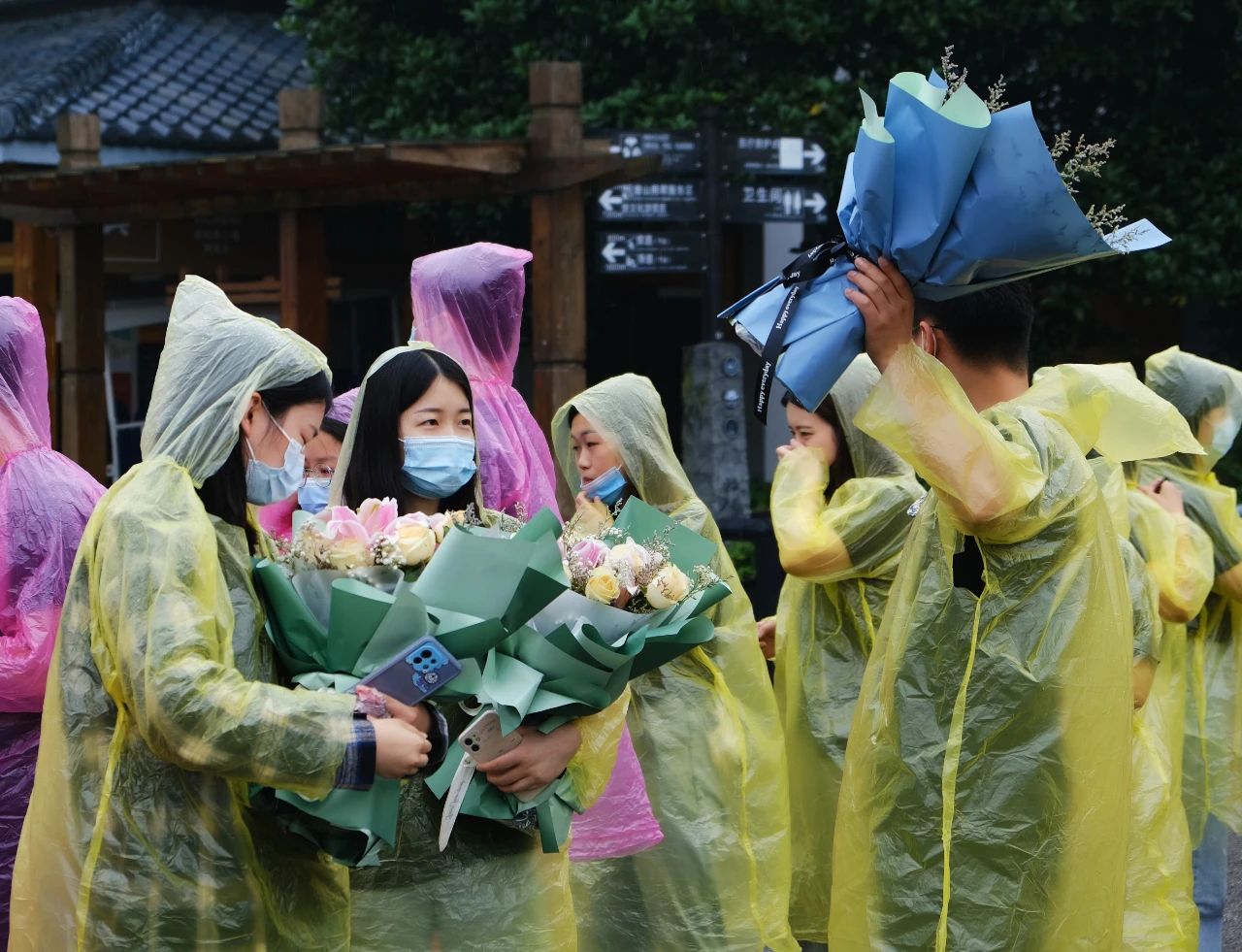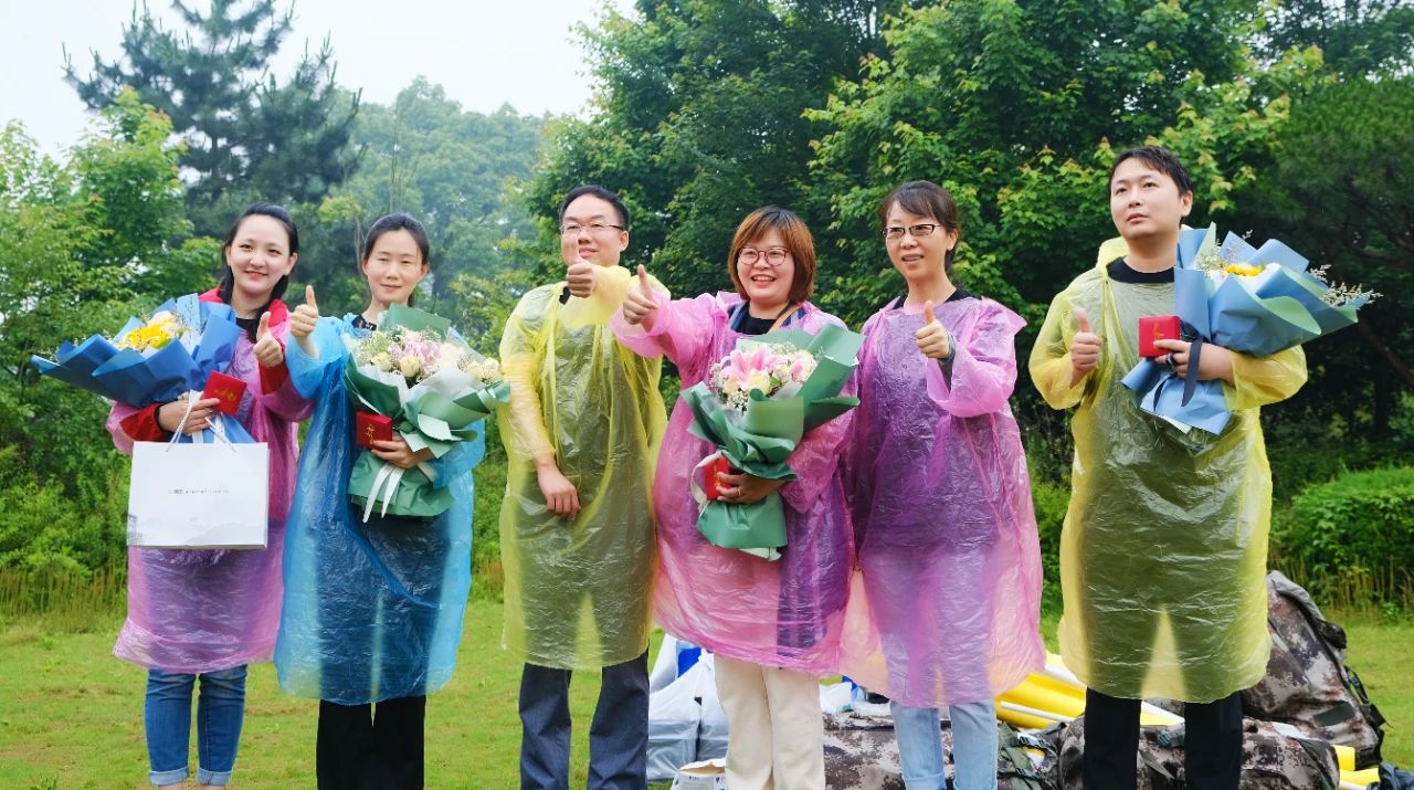 活動當(dāng)天雖當(dāng)天上午持續(xù)陰雨連綿,但是出游的同事們并未停下腳步,路途大巴上交談甚歡載歌載舞,欣喜之情溢于言表,穿上花花綠綠的雨衣在雨霧中穿行,在東湖磨山水墨畫一般的景色中劃出一條彩色的長線,亦是一道別樣的風(fēng)景。