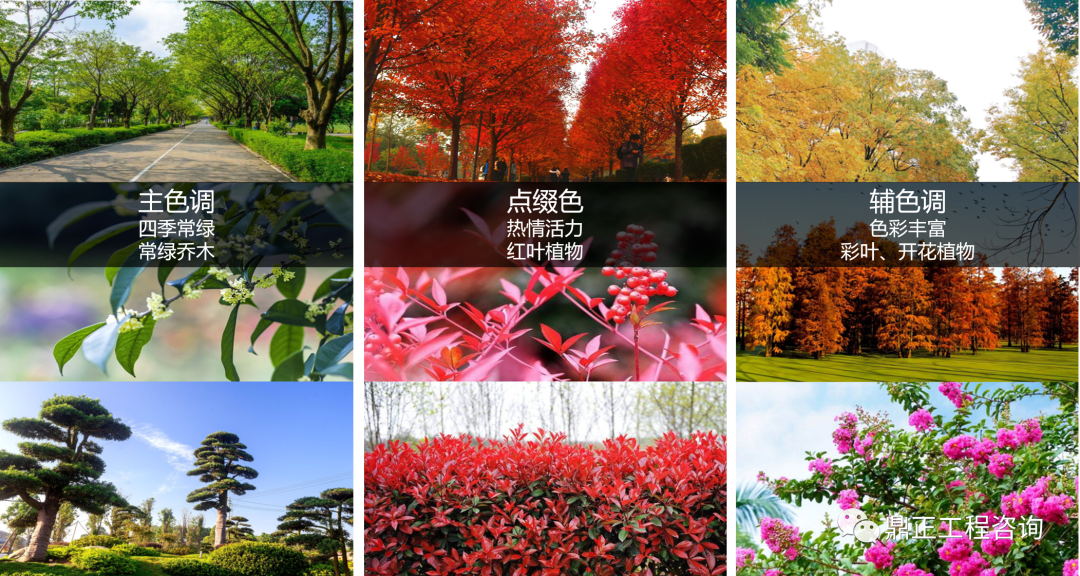 “生態(tài)園區(qū),四季有花,處處皆景”——以常綠植物襯底,紅色植物點睛,色葉交融。