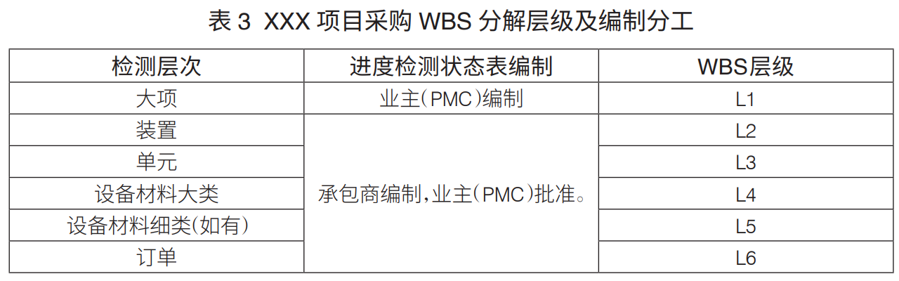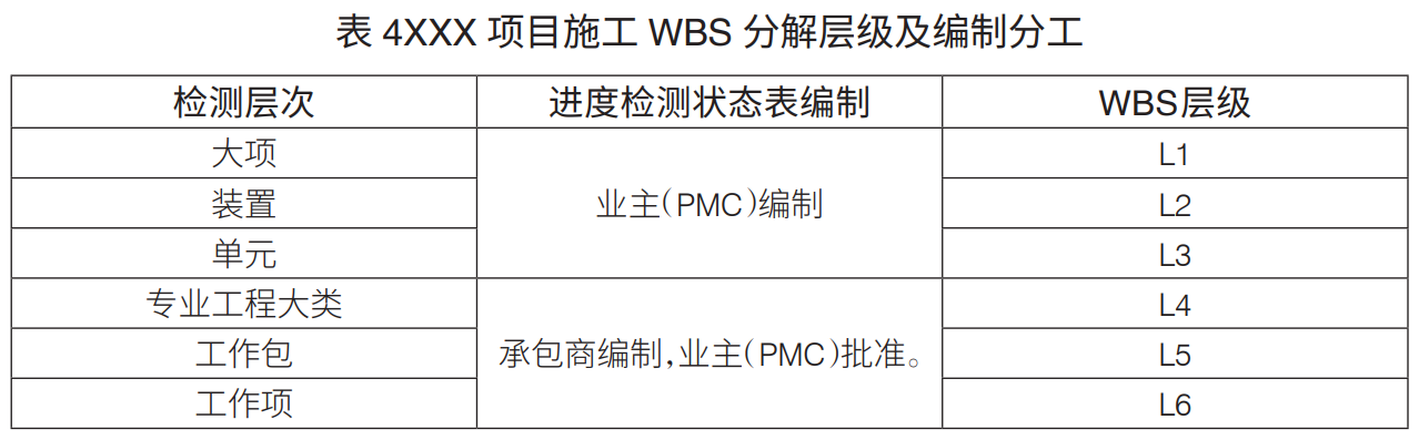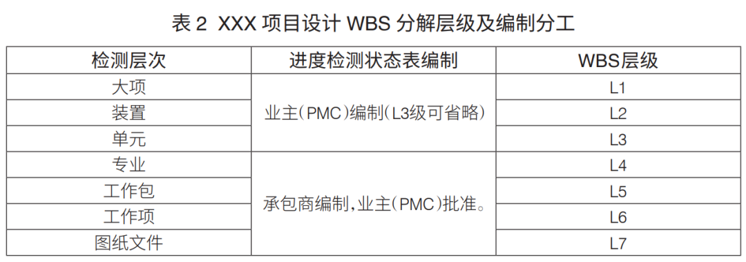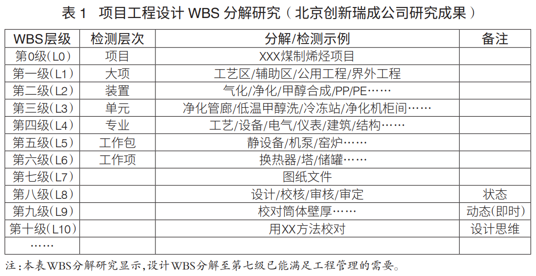 工程項目WBS分解層級:工程項目WBS分解主要是進行設計、采購、施工WBS分解。通常,設計WBS分解至七級、采購WBS分解至六級、施工WBS分解至六級,可滿足工程管理要求(表1)。