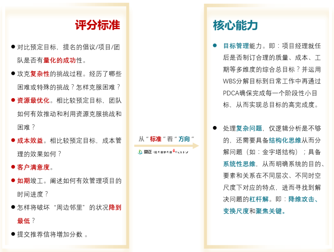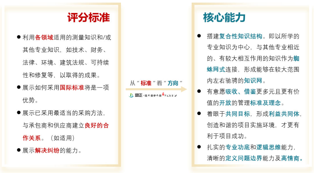 通過(guò)此次評(píng)獎(jiǎng)申報(bào)過(guò)程中的思考與體會(huì),我們想從RICS中國(guó)獎(jiǎng)評(píng)分標(biāo)準(zhǔn)談?wù)勴?xiàng)目經(jīng)理的努力方向。無(wú)論是投資決策咨詢、規(guī)劃設(shè)計(jì),還是政府采購(gòu)與招標(biāo)代理、工程造價(jià)咨詢、工程監(jiān)理及項(xiàng)目管理咨詢的項(xiàng)目經(jīng)理,都需要明確?優(yōu)秀的項(xiàng)目管理是什么樣的?要實(shí)現(xiàn)這些成果需要培養(yǎng)并精進(jìn)哪些核心能力?