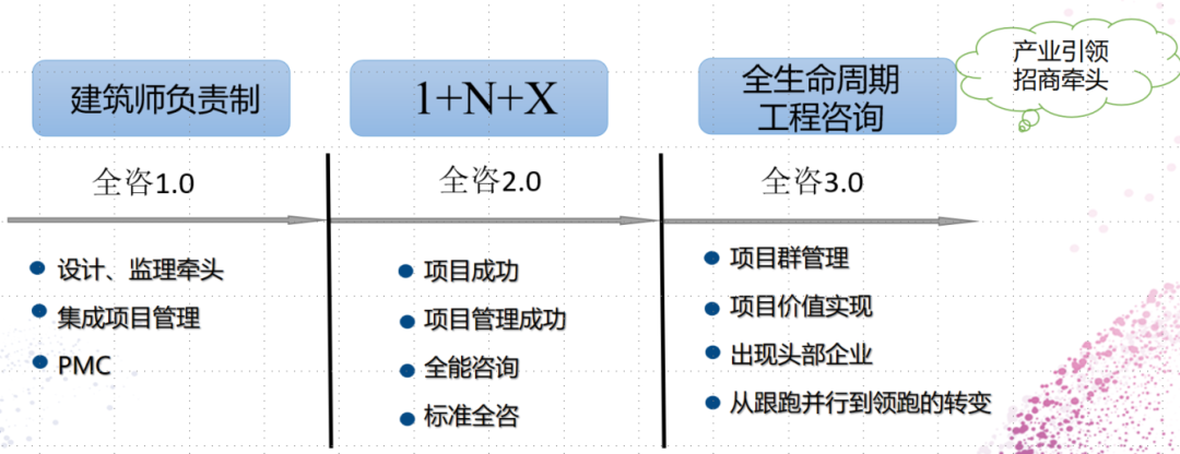 在總書記全生命周期管理思想的指導下,中國的“全咨”已經由“全過程工程咨詢”過渡到“全生命周期工程咨詢”,進入了全咨3.0時代。全咨3.0要點是全咨邊界向前擴展到“招商引資”,向后延伸至“運營維護”。