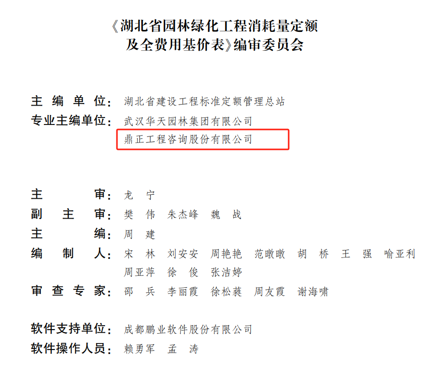 鼎正作為《湖北省園林綠化工程消耗量定額及全費(fèi)用基價(jià)表》《湖北省建筑安裝工程費(fèi)用定額》的參編單位之一,充分發(fā)揮全過(guò)程工程咨詢資源集中的優(yōu)勢(shì),為此次定額的修訂貢獻(xiàn)了鼎正在全過(guò)程工程咨詢、工程造價(jià)咨詢業(yè)務(wù)領(lǐng)域編審設(shè)計(jì)概算、投資估算、工程預(yù)算、過(guò)程結(jié)算、竣工結(jié)算等實(shí)踐經(jīng)驗(yàn),對(duì)進(jìn)一步完善工程造價(jià)計(jì)價(jià)依據(jù)體系提供了有力的技術(shù)支撐。
