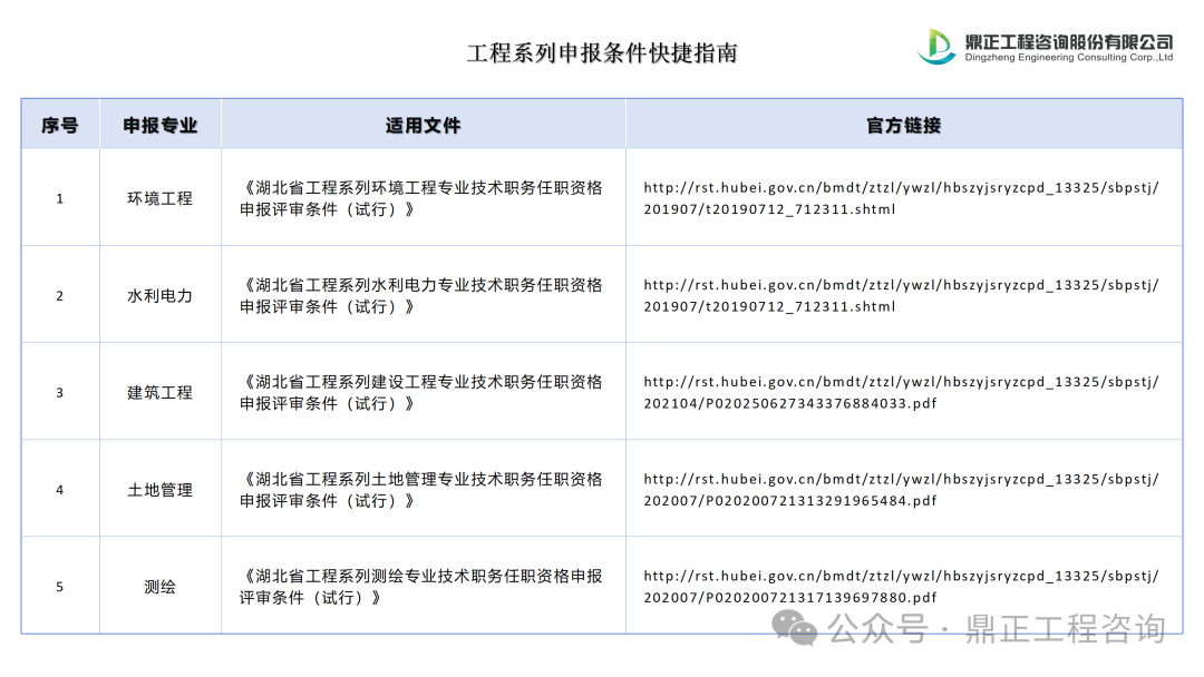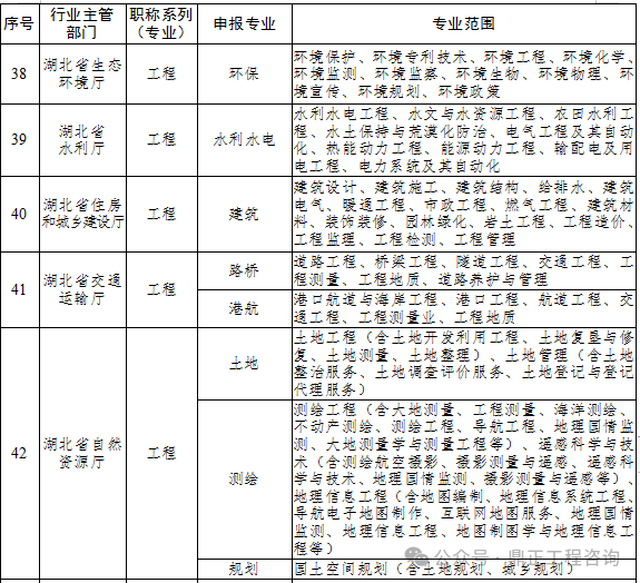 鄂職改辦已下發(fā)《湖北省職稱評(píng)審專業(yè)目錄》(鄂職改辦〔2021〕46號(hào)),其中工程系列已涵蓋環(huán)保、水利水電、建筑、土地、測(cè)繪、規(guī)劃等相關(guān)專業(yè),詳見下圖: